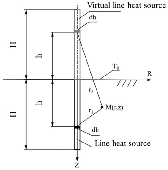 Figure 2, the concept of the virtual heat source method involves placing a virtual line heat sink at the mirror-symmetric position of the borehole with respect to the ground surface. This virtual sink has the same length and heat flux magnitude as the real borehole but with an opposite heat flow direction. The superposition of the real and virtual sources ensures that the ground surface temperature remains constant. The model is based on the following assumptions: 1. The initial temperature of the subsurface soil is spatially uniform. 2. The ground surface temperature remains constant and is equal to the initial soil temperature. 3. The subsurface soil is treated as a semi-infinite heat transfer unit. 4.The thermal properties of the soil are homogeneous and temperature-independent. 5.The borehole geometry is neglected, and the borehole is approximated as a finite-length line heat source along its vertical axis.