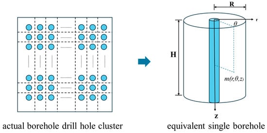 By combining Equations (6) and (8), a thermal response model for the heat flow from a single pipe to the heat storage unit can be established. Owing to the symmetrical arrangement of the buried pipes, it is sufficient to calculate only one-eighth of the domain to obtain the overall temperature response. To address the computational complexity introduced by the large number of buried pipes in practical engineering applications, this study further proposes an equivalent single-pipe model. In this model, the distributed heat sources are represented by a single, centralized line heat source located at the center of a cylindrical heat storage unit, while preserving the total heat input and geometric volume.