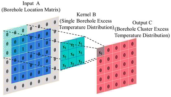Figure 5, when the input layer region corresponding to the convolution kernel contains 1, it indicates that the position is affected by borehole heat. After calculation, only the positions with a value of 1 in the input layer generate excess temperature, while positions with a value of 0 have no heat contribution. The calculation results are assigned to the corresponding output layer positions. When the convolution kernel covers multiple drill holes, the thermal effects of multiple drill holes are automatically superimposed, making the two-dimensional discrete convolution results completely consistent with the direct nesting method. Let the drill hole position matrix be