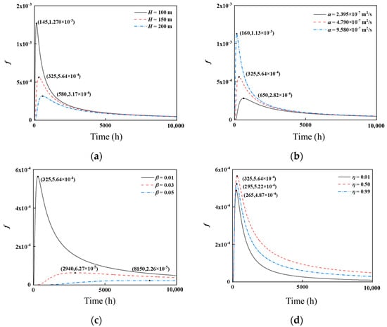 According to the finite line heat source model, determining the average temperature of the thermal storage unit is equivalent to evaluating the dimensionless temperature response of the heat input over the entire volume. Once the dimensionless temperature response at a single point is established, the overall response can be obtained by performing a volume-averaged integral. According to Equations (5) and (6), the key to determining the average temperature of the thermal storage unit lies in calculating the partial derivative G′ of the storage unit’s G-function with respect to the Fourier number, as well as the corresponding value of F.