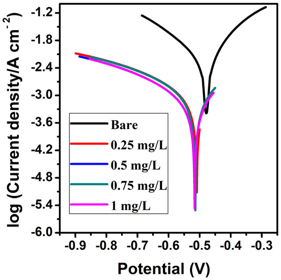 Potentiodynamic polarization was recorded for the IS-2062 MS electrode in 3 M HCl without and with 0.25 mg/L, 0.5 mg/L, 0.75 mg/L, and 1 mg/L of expired ESLD at room temperature (303 K), and is presented in Figure 2 and Table 1. It is shown that corrosion current (Icorr) values significantly reduce with the introduction of expired ESLD, leading to enhanced protection efficiency. The Icorr value is high in the bare system compared to the protected system (expired ESLD), which is due to the aggressive nature of the 3 M HCl solution on the surface of MS. The aggressiveness of 3 M HCl is lessened when an inhibitor is present and increases the effectiveness of protection. Therefore, when the concentration of the inhibitor rises, so does the efficiency of inhibition. This can also be attributed to the formation of an adherent invisible layer over the surface of MS [26]. The values of the anodic (βa) and cathodic (βc) Tafel slopes do not differ significantly. Further, only minor variations (less than 85 mV) in the corrosion potential (Ecorr) were observed when compared with the bare solution. This finding confirms that expired ESLD belongs to the mixed mode corrosion inhibitor. This inhibits the processes of anodic and cathodic disintegration [27]. Generally, the materials with Ecorr and lower Icorr values exhibit better corrosion resistance [28].