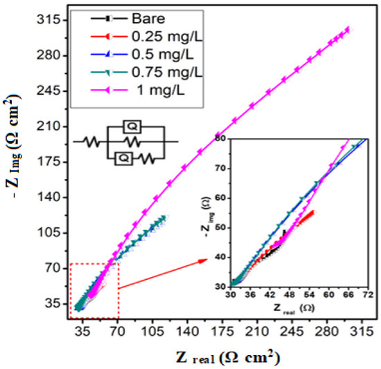Nearly semi-circular Nyquist plots show the process of charge transfer at the electrode/electrolyte interface [29]. Nyquist curves show imperfect single depressed capacitive loops with nearly identical shapes in the presence and absence of inhibitors, suggesting that the corrosion mechanism remains unchanged [30].