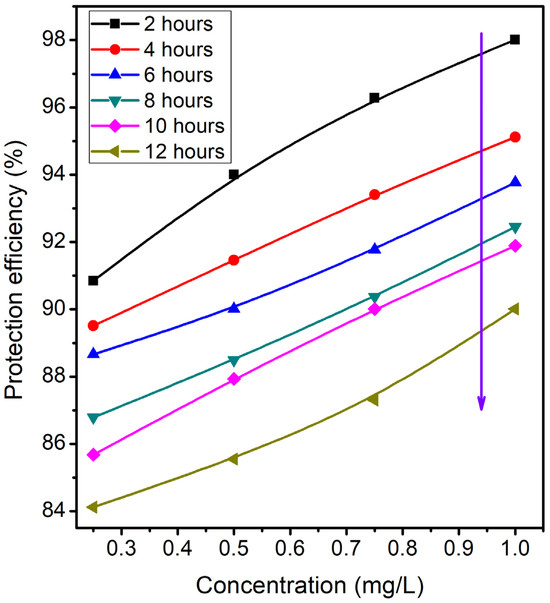 The relationship between the concentration of inhibitor and protection efficiency at different exposure periods.