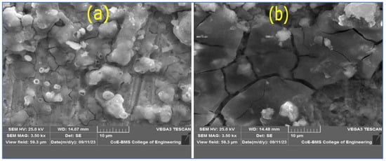 The SEM technique was used to examine the surface morphology of MS in inhibited (1 mg/L of expired ESLD) and uninhibited aggressive solution with an immersion period of 4 h. The corresponding SEM results are shown in Figure 5. It is observed that the MS surface is greatly damaged with a rough structure without the addition of expired ESLD. In the presence of 1 mg/L of expired ESLD, the MS surface becomes uniform and smooth, and enlarged domain sizes in Figure 5b are proof of the passage of corrosive moieties being blocked. This variation (from an uninhibited to inhibited system) fully confirms the protection efficiency of expired ESLD. The expired ESLD molecules undergo interaction with the MS surface and create a barrier layer which reduces the aggressive nature of the 3 M HCl solution on the MS surface.