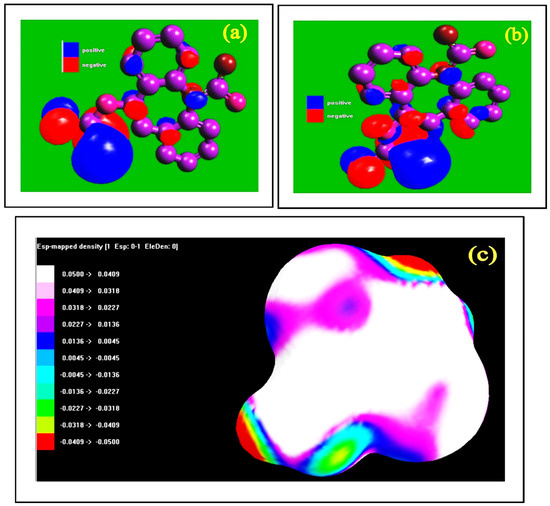 DFT results: (a) HOMO, (b) LUMO, and (c) density mapping of an expired drug.
