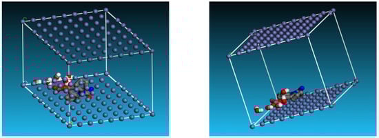 Monte Carlo (MC) simulation was used to analyze the interaction between the Fe (1 1 0)/H2O and expired ESLD molecule. The most stable configuration for drug adsorption from expired ESLD at the interface Fe (1 1 0)/H2O is shown in Figure 8. Because of the high electron density of the expired ESL drug, the molecule aligns parallel to the Fe surface in this conformation, maximizing contact to increase surface coverage. Table 5 displays data indicating that expired ESLD molecules have higher adsorption energy than water molecules. An exceptionally high negative adsorption energy leads to stronger bonding to the Fe surface and the formation of a stable barrier film that effectively lowers MS corrosion. This finding supports the high inhibition efficiency observed in experimental studies and validates the role of expired drugs as a highly effective inhibitor against MS corrosion in environments containing 3 M HCl [39,40,41]. Figure 9 illustrates the schematic depiction of expired ESLD adsorption on the iron surface. As per the figure, the ESLD molecules positioned themselves on the Fe surface in an aqueous environment and blocked the surface against corrosive moieties in acidic solution. Such a molecular scheme may deepen our understanding of the role of ESLD as an anticorrosive agent. Overall, the results of the experimental studies are in good agreement with the DFT and MC simulation studies.