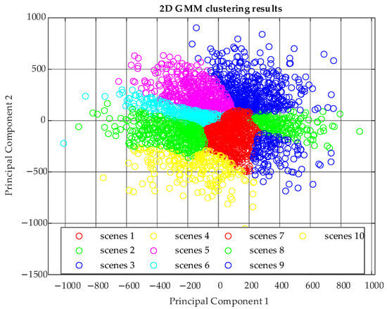 The Gaussian mixture model assumes that all randomly generated scenarios can be represented as linear combinations of multiple Gaussian distributions. It estimates the parameters of each distribution—including the mean, covariance matrix, and weight coefficients—using the expectation-maximization algorithm. During the clustering process, the Gaussian mixture model groups similar scenarios into the same class based on their distribution characteristics, generating a limited number of representative typical scenarios. Each typical scenario captures the main features of its corresponding class. Additionally, the Gaussian mixture model calculates the probability of occurrence for each typical scenario, providing more accurate and comprehensive foundational data for quantifying energy storage demand. This approach not only reduces computational complexity and improves efficiency but also ensures that the scenarios are both representative and scientifically robust. The clustered typical scenario data serve as inputs for detailed analyses of subsequent energy storage requirements for frequency regulation and load balancing. The effectiveness of the Gaussian mixture clustering is illustrated in Figure 1.