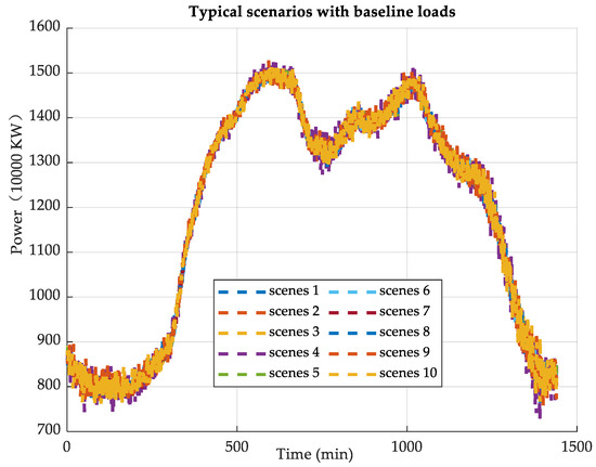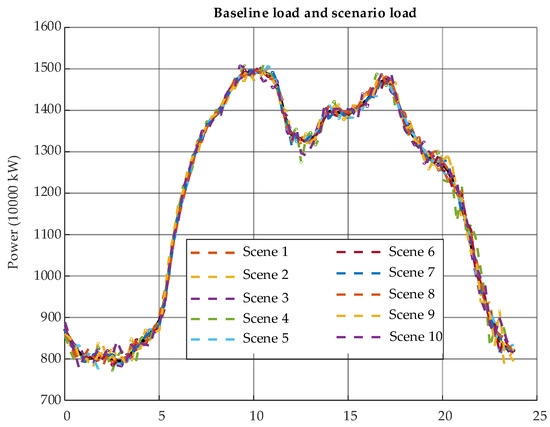 In Figure 2 and Figure 3, the blue solid line represents the actual load, while the dashed line represents the predicted load under 10 typical scenarios. Additionally, the 10 typical scenarios are based on probability distributions, so the upper and lower bounds of the entire curve represent the actual predicted power range. Comparing the variation over 24 h, it can be observed that the load is at its minimum between 0 and 5 h, no greater than 9000 MW. After 5 AM, the load increases steadily, reaching the first peak around 11 to 12 AM at about 15,000 MW, followed by a slight decrease in the next two hours. After 1 PM, the load continues to rise, reaching its maximum value of approximately 15,000 MW between 5 and 8 PM, and fluctuates around this value. After 8 PM, the load continuously decreases, and the cycle repeats at 24 h.