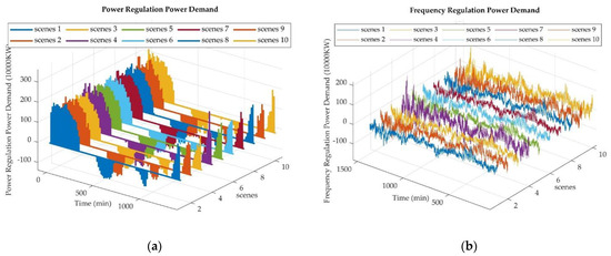 According to the joint optimization model constructed in this paper, 10 typical scenarios were simulated for the optimized model. Figure 4a,b shows the peak shaving and frequency regulation power curves for the 10 typical energy storage scenarios, where positive and negative values represent discharge and charge of new energy storage, respectively.