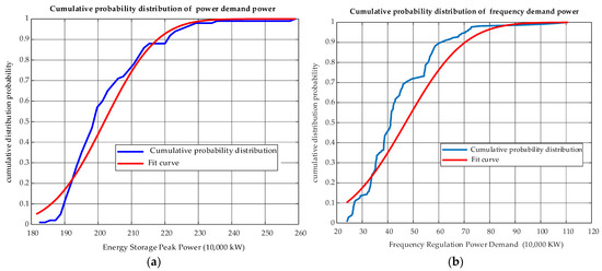 The quantile regression method is applied using historical data from the Northeast China power grid to derive the fitting function. Based on this function and the available data, the growth rate of future peak shaving and frequency regulation demands for the Northeast China power grid is predicted. To comprehensively evaluate economic benefits, this study employs a cumulative probability distribution approach. The power demands of the ten scenarios, along with their probabilities, are ranked and accumulated, followed by quantization through curve fitting. The quantization results for peak energy storage power are illustrated in Figure 5a, while those for frequency modulation energy storage power are shown in Figure 5b. The fitting curves effectively encompass all data points, ensuring the precision and reliability of the quantile regression method.