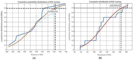Fitted curves for the relationship between power, capacity, and confidence in meeting demand (The dotted line is an auxiliary line to determine the predicted value). (a) Cumulative probability distribution of SOC maxima. (b) Cumulative distribution of SOC maxima.