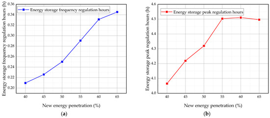 New energy penetration sensitivity plot. (a) Plot of energy storage frequency regulation hours versus new energy penetration rate. (b) Plot of energy storage peak regulation hours versus new energy penetration rate.