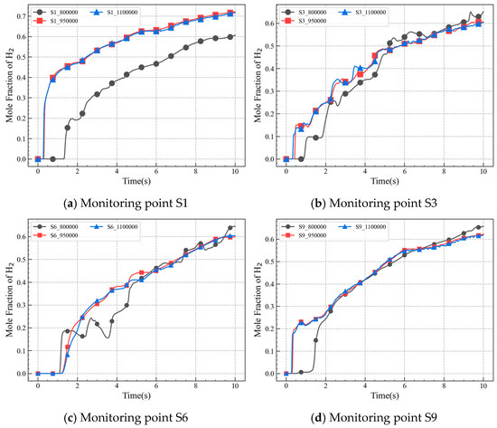 This study used ICEM to generate structured meshes on a simplified geometry. A notional nozzle model was used to reduce computational costs. The notional nozzle diameter was 64 mm. An O-block method was used for meshing around the leakage area with refinement. The far-field meshes were appropriately sparse, ensuring a smooth transition in mesh density. Mesh independence tests were conducted using three sets of meshes with counts of 800,000, 950,000, and 1,100,000, as shown in Figure 3. The results of monitoring points 1, 3, 6, and 9 (S1, S3, S6, and S9) show that the hydrogen mole fractions are very close when the mesh count reaches 950,000. The locations of the monitoring points are shown in Table 1. This indicates that beyond this count, the mesh size has a minimal impact on the results. Ultimately, a mesh count of approximately 950,000 was used, as shown in Figure 4.