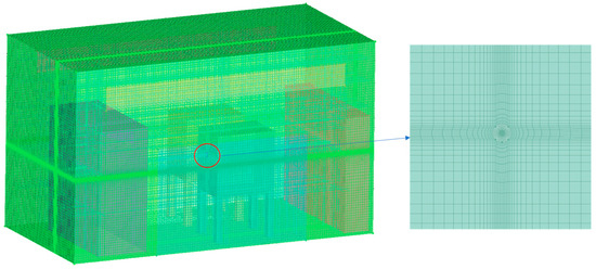 In this study, a fuel cell booth with dimensions of 5.0 m × 2.5 m × 3.0 m was modelled based on an existing skid-mounted hydrogen refueling station. The fuel cell system included two fuel cells. Windows and doors were provided on both sides of the fuel cell system. The simplified model is shown in Figure 2.