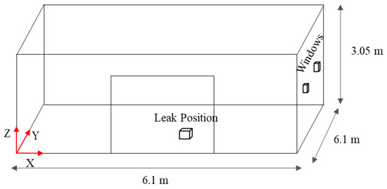 Experimental data from the literature were used to validate the numerical model used in this study [28]. The experiment was conducted in a garage with dimensions of 6.1 m length, 6.1 m width, and 3.05 m height. The front wall of the garage featured a door that was 2.4 m long and 2.1 m high, located at the center of the bottom of the wall. On the right wall, at a height of 2.1 m, there were two square windows, each with a side length of 0.2 m. The garage and the skid-mounted fuel cell system in this study are both enclosed spaces with windows and doors. Despite differences in specific details, the two scenarios possess inherent similarities in their physical characteristics. Therefore, it is reasonable to use the experimental data for the validation of the simulation methods. In the experiment, hydrogen was introduced into the garage from the top of a rectangular box located at the center of the garage. The box measured 0.305 m by 0.305 m in width and height, with a height of 0.15 m, as shown in Figure 5. The mass flow rate of the hydrogen leakage was 83.3 g/min, and the leakage duration was 3651 s.