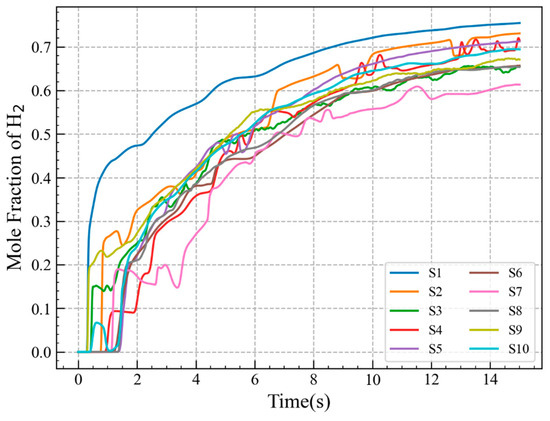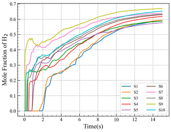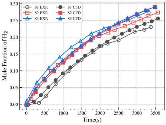 The hydrogen mole fraction evolutions at monitoring points S1, S2, and S3, are compared in Figure 6. The simulated hydrogen concentration results at monitoring points S2 and S3 remain largely consistent throughout the leakage process, with slight differences compared to the experimental results. For monitoring point S2, the simulation results closely match the experimental results during the first half of the leakage phase. In the second half of the leakage phase, the simulated concentration is slightly higher than the experimental results. For monitoring point S3, the experimental concentration is higher than the simulated results during the first half of the leakage phase. In the second half, the simulated results align closely with the experimental results. The simulation results at monitoring point S1 show a similar trend to the experimental results, with the simulated concentration being slightly higher than the experimental concentration. Overall, using CFD to simulate the concentration distribution of hydrogen leakage is feasible in confined spaces.