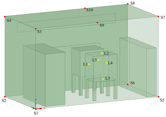 It is not feasible to conduct hydrogen leakage experiments in actual facilities due to the safety requirements for station operations. The geometric model in the CFD simulation was constructed according to the actual scenario, and the boundary conditions were completely consistent with the actual operating parameters. The accuracy of the model is constructed based on mapping actual scenarios, and the simulation methods used have been validated. Therefore, it can be assumed that the training data relying on CFD can represent real-world scenarios. Data samples for various leakage locations should be generated to train the multilayer feedforward neural network. This paper identified five locations with a high risk of leaks. The leakage locations are shown in Figure 7, and the positions of the leak points and monitoring points are given in Table 1.