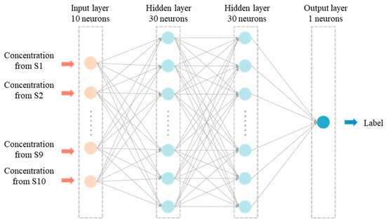 The model structure is shown in Figure 10. The network structure was determined by grid search, with accuracy serving as the evaluation metric. This approach identified the network structure that achieved the highest accuracy. The final structure was a 10–30–30–1 network. The network consisted of one input layer, two hidden layers, and one output layer, with the numbers indicating the count of neurons in each layer. The input layer received concentration data from 10 monitoring points at a specific time step. The network weights were computed to output the predicted leakage location. The network contained (10 + 1 + 2) × 30 + 1 weights. Due to the complexity of this structure, manually adjusting these weight parameters becomes impractical. Instead, the backpropagation algorithm was utilized to automatically adjust the weight parameters and train the network.