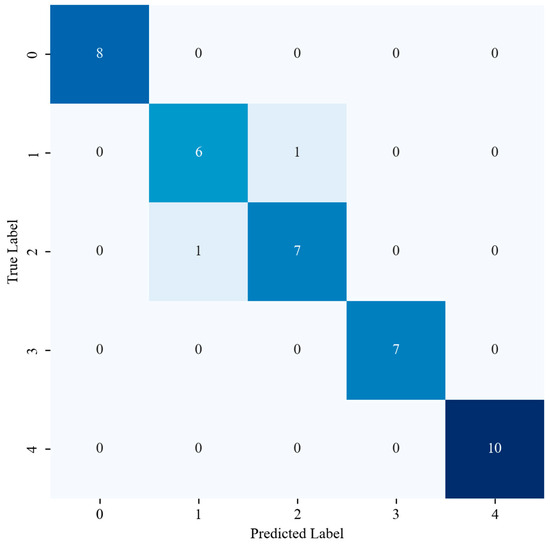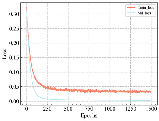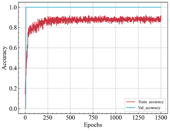The changes in accuracy and loss values for the training and validation sets with optimal hyperparameters across epochs are shown in Figure 11 and Figure 12. Results show that both curves quickly reach a state of convergence during the training process. After 1500 training epochs, the model achieves ideal classification accuracy on both the training and validation sets. The accuracy is 95%, and the precision, recall, and F1 score for leakage locations numbered 0, 3, and 4 are all 1. The precision, recall, and F1 score for leakage locations numbered 1 and 2 are also close to 1.