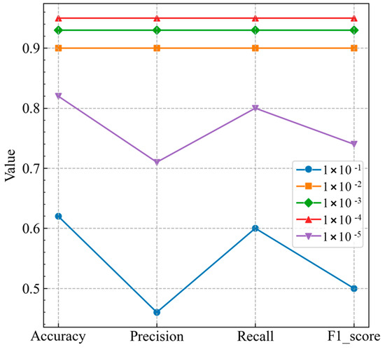 The impact of hyperparameters on model performance was further investigated. The study analyzed the effects of the learning rate, batch size, and training epochs on model performance, keeping the other parameters at optimal values for the best network structure and hyperparameter combination. The results are shown in Figure 15, Figure 16 and Figure 17. The results indicate that the model performance is primarily influenced by the learning rate. Although the Adam optimizer adapts the learning rate, it only reduces sensitivity to the initial learning rate to some extent. The initial learning rate remains a critical hyperparameter, which affects the training speed, stability, and final performance of the model. The initial learning rate directly impacts training speed. A lower learning rate means smaller updates of model parameters with each iteration, which may slow convergence and require more training time and iterations. The initial learning rate also significantly affects the model ultimate performance. A low learning rate may trap the model in local minima, which may prevent the model from escaping to global optima. Conversely, a high learning rate may cause large updates with each iteration. The large updates can overshoot the global optimum and lead to divergence. The initial learning rate also significantly impacts training stability. An appropriate rate ensures the model converges within a reasonable time and prevents unstable gradient updates during training. Setting the learning rate too high may cause unstable training and excessive parameter updates, resulting in oscillations in loss function. Conversely, setting the learning rate too low may stall the model optimization. Therefore, an appropriate learning rate to balance convergence speed and stability is crucial for achieving optimal model performance.