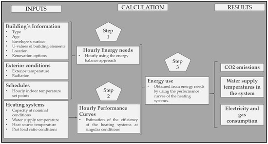 Applying Equations (1)–(6) allows us to estimate the hourly heating demand needed in that specific hour to maintain the indoor conditions (Tb). We make this calculation in all the hours of the heating season. The yearly heating demand is calculated by summing all the hourly results and applying an utilization factor of the heating facility based on TABULA methodology [15]. We apply this factor because the results obtained by applying the methodology explained above are considered theoretical. The final use of the heating facility depends on the final user behavior, which can differ from the theoretical assumption considered.