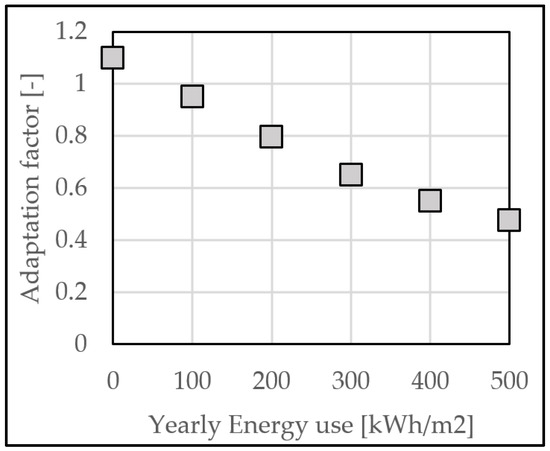 where is the yearly energy used in the building in kWh/m2. Figure 2 shows the order of magnitude of the Uf. Finally, the real heating demand is calculated by multiplying this factor by the theoretical heating demand calculated in Equation (6). Equation (8) shows this approach: