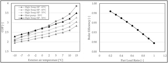 The heat pump efficiency, in this case for air/water heat pumps, was modelled with two different equations that represent their efficiency: Capacity and Coefficient of Performance (COP) as functions of the exterior air temperature and water supply temperature (Equations (9) and (10)). The efficiency of the boiler depends on the water supply temperature and the part load ratio (PLR) conditions (part load conditions refer to conditions in which the heating system is providing less heat than its nominal capacity). Assuming a constant water supply temperature from the boiler, its efficiency would only depend on its PLR conditions (Equation (11)). PLR is a coefficient calculated by dividing the heat provided by the maximum heat the boiler can provide in those conditions.