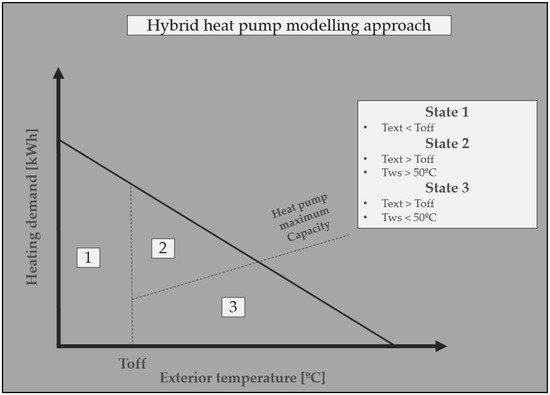 When we model a hybrid heat pump, we must consider the performance curves and the control strategies. We modelled the hybrid heat pump based on three states: state 1 is when the heat pump cannot work, and only the boiler can provide the heating demand. This state occurs when the exterior temperature is lower than the minimum exterior temperature at which the heat pump can work. If we want the heat pump to work as much as possible without using gas, this temperature should be around the minimum temperature at which the heat pump (Toff) can operate, which usually could be −10 °C or −20 °C. In this study, we assume that only the boiler works if the exterior temperature is below −10 °C, only the boiler will work; the working system state is 1. In state 2, the heat pump and the gas boiler work together. In this state, the exterior temperature is higher than Toff but the radiators need a higher temperature than the heat pump can deliver. The maximum water temperature that we consider the heat pump to be able to deliver is 50 °C, so if the radiators demand 60 °C, the boiler should complement the heat pump; the working state is 2. In state 3, the heat pump provides all heating, and the boiler is not working. In state 3, the exterior temperature is above −10 °C and the required radiator temperature is below 50 °C. Figure 4 summarises this control.