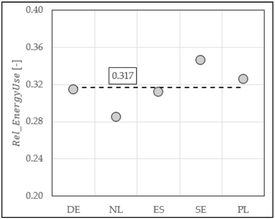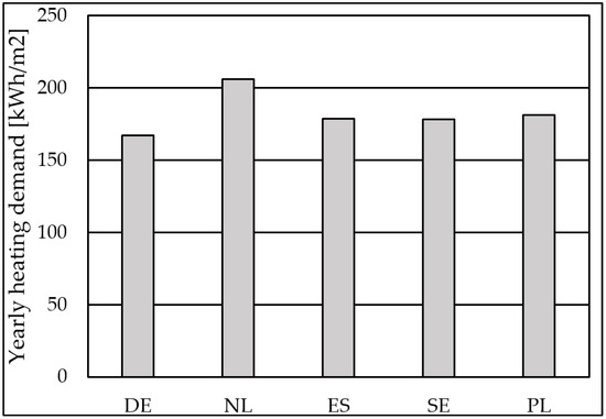 The results in Figure 5 show that the heating demand in the selected buildings is between 160 and more than 200 kWh/m2 a year. The heating demand depends not only on the exterior conditions but also on the level of insulation of the building. The buildings from Spain and Sweden have similar heating demands even though the Swedish climate is much colder. On the other hand, the building from Sweden has a higher-quality envelope characteristic than the rest of the buildings.