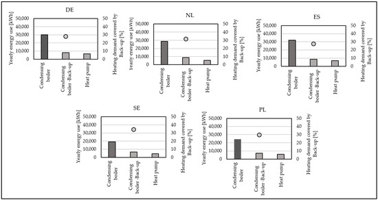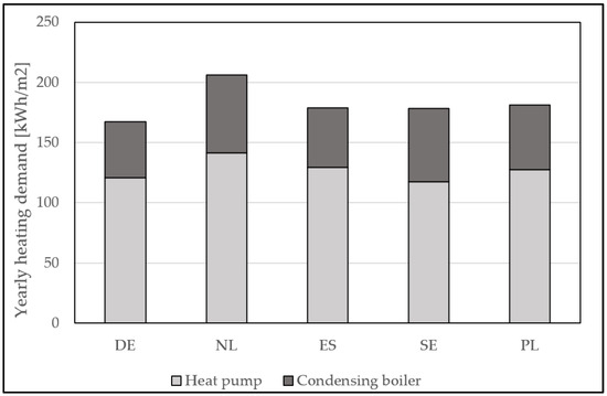 We observe a higher contribution of the condensing boiler in the Netherlands and in Sweden. The condensing boiler only works if the exterior temperature is lower than −10 °C or if the hydronic facility needs more than 50 °C. The building envelope for the building located in the Netherlands has very low quality compared with the other buildings, and often, the hydronic facility connected to the radiators needs more than 50 °C. In Sweden, the exterior temperatures can be very low in winter, so the heat pump will be switched off for security reasons. Spain has the lowest boiler contribution, as the building has average U-values compared with the other buildings, and the climate is mild, which gives more opportunities to operate the heat pump.
