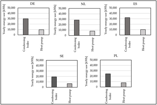 In Member States like Germany and Spain, even though the electricity consumption from the heat pump is much lower than the gas consumed by the gas boiler, the yearly energy costs are quite similar. This is because the difference in price between gas and electricity, with gas price being the lowest, is higher than the improvement in the efficiency of the system by using a heat pump. In countries like the Netherlands and Sweden, the situation is very different, as the consumption of electricity by a heat pump, hybrid or high-temperature, leads to cost savings of around 60–75% at the end of the year. However, in the case of Poland, the electrification of heating offers no economic benefit based on data used in this study and in the current context, as the yearly energy costs will increase.