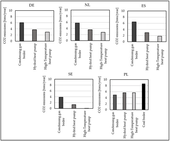 The decarbonisation results strongly depend on how much the electricity generation is decarbonised. For this reason, in Member States like Spain or Sweden with low CO2 emission factors, if we electrify 100% of the heat using a high-temperature heat pump, the CO2 emissions are lower than if we use a hybrid heat pump. Moreover, when the CO2 emissions are at intermediate levels, as in Germany and the Netherlands, high-temperature heat pumps and hybrid heat pumps have similar amounts of CO2 emissions (with the former being slightly lower). As mentioned above, Poland has a high CO2 emission factor, which negatively impacts the electrification of the heating demand in buildings. For this specific case of Poland, we added a comparison with a coal boiler, due to the large share of this type of heating technology in Polish residential buildings [22]. The CO2 emission factor assumed for coal is 354 g/kWh. We considered the same performance curve for the boiler but changed the energy carrier. So, the energy use is the same, but now, the energy carrier of the boiler is coal and not natural gas for this specific case. We can see in Figure 9 that even if the electrification of heating through heat pumps in Poland is not a decarbonisation option, it is still better than providing heating with coal boilers.