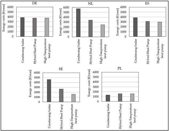 We applied these prices to the energy use of the different heating solutions (reference and two alternative systems). Figure 10 shows the energy consumption costs of the current condensing gas boiler installed and the two high-temperature heating systems proposed. The approach has a different tendency depending on the Member State analysed.
