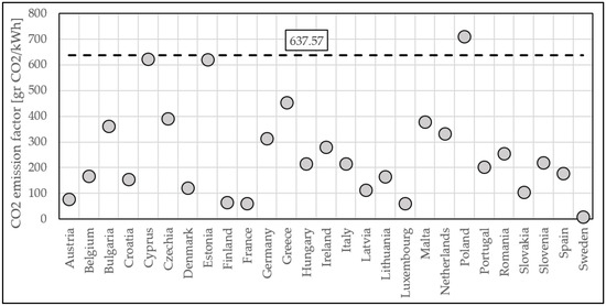 Solving Equation (17), we obtain the CO2 emission factor at which high-temperature heat pumps emit more CO2 than condensing boilers, which is 637.57 gr CO2/kWh. Taking into account the CO2 emission factors of all the Member States provided by [21], we can identify the Member States where a full electrification of the heating system is inadvisable in terms of CO2 gas emissions.