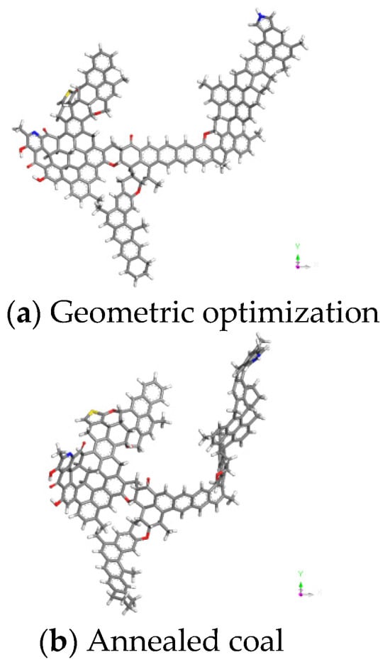 The molecular mechanics and molecular dynamics of the coal molecular structure were optimized using the Forcite module of Materials Studio (MS) 2019. The optimized parameters and results are available in the literature [], and the macromolecular planar model is shown in Figure 1.