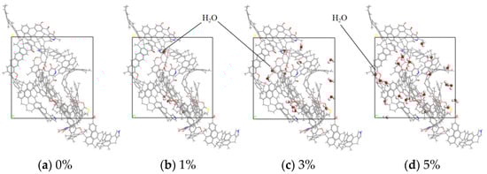 Through the Amorphous Cell module of MS, three coal molecules were added to establish a crystal cell with a density of 1.3 g/cm³, and the molecular mechanics and dynamics were optimized with the same parameters as those above. The number of water molecules in the cell at different moisture contents was obtained by calculation, as indicated in Table 1. With the Locate Task Item of the Sorption module, a certain number of water molecules was preadsorbed to build a molecular model of coal with moisture contents of 1%, 3%, and 5%, as shown in Figure 2.
