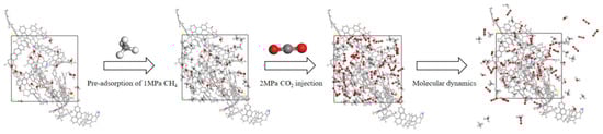 After establishing the initial CH4 model, 2 MPa CO2 was injected into the coal molecules, and molecular dynamics calculations were performed to simulate the diffusion of CH4 and CO2 molecules during the gas injection displacement process. The molecular dynamics parameters were set as follows: the Dynamics task of the Forcite module was used, the force field was COMPASS, the system was NVT, the temperature was 298 K, the temperature control method was Nose, the pressure control method was Berendsen, and the total simulation time was 500 ps. The flow chart of the gas injection simulation is given in Figure 3.