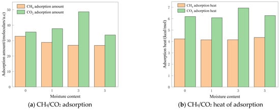 Figure 4b indicates that the average equivalent heat of adsorption of CH4 decreased and then increased with the change in the moisture content, but the change was weak. The average equivalent heat of adsorption of CO2 also decreased then increased at a 0–3% moisture content. When the water content was small, because of the adsorption advantage of the water molecules in coal, the high-energy adsorption sites were preferentially occupied by the water molecules. The water molecules competed for adsorption with CH4 and CO2, and the heat of adsorption of the two decreased. When the water content increased, the water molecules formed different polyhedral clusters because of coalescence. The formation of water clusters generated heat. The CH4 molecules generated hydration molecules with the water molecules to release heat, and the CO2 and water molecules combined to form carbonic acid to generate heat [] until the amount exceeded the maximum saturation level of the moisture content. CO2 also had a large number of desorption sites, leading to the reduction in the heat of adsorption.