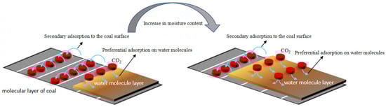 Li et al. [] proposed the extended Langmuir–Brunauer–Emmett–Teller BET adsorption model, which considers the synergistic relationship between CO2 and water molecules and assumes that readily adsorbable water molecules form an aqueous layer as a secondary adsorption site and further adsorb CO2 through hydrogen bonding interactions and hydration reactions. Li et al. [] also used this model to compare the adsorption energy. They found that when water molecules form a water molecule layer, the adsorption capacity of the secondary adsorption sites provided is higher than that of the surface of the coal molecules; as a result, CO2 molecules are preferentially adsorbed on the secondary adsorption sites, but the number of secondary adsorption sites available is not as large as that on the surface of the coal molecules (Figure 6). This finding indicates that the adsorption sites for coal molecules are basically occupied by water molecules when the moisture content exceeds the saturation degree. CO2 is only adsorbed at the secondary adsorption sites, and the coal surface has no adsorption sites. When the moisture content does not reach the saturation level, the secondary adsorption sites of the water molecule layer and the adsorption sites on the surface of the coal molecules adsorb CO2 together, so the adsorption amount shows inconsistent changes before and after. Yang et al. [] found that H2O affects coal’s adsorption of CO2 depending on the dissolution capacity and competitive adsorption. The dissolution of CO2 in H2O dominates at a lower moisture content, leading to an increase in the CO2 adsorption capacity of coal, while the opposite trend is observed for coals with a high moisture content, which is consistent with the findings of this paper.