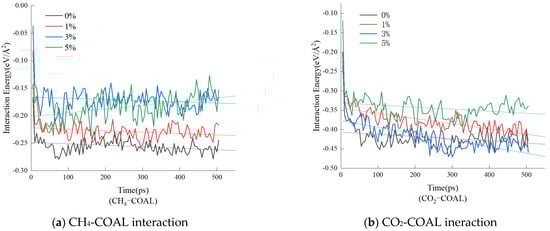 As shown in the figure, the interaction energy between gas and coal molecules had a negative value. The smaller the value was, the stronger the interaction was. The interaction energy of CH4 and coal molecules revealed that in the presence of water molecules, the interaction energy increased, and the strength of the interaction decreased because the water molecules replaced the adsorption sites of CH4. The interaction energy at a 1% moisture content was smaller than that at 3% and 5%, that is, the interaction between CH4 and coal at a 1% moisture content was stronger than that at 3% and 5% moisture contents. At this time, the promotion of CO2 adsorption by the water molecules was not obvious, so the effect of the CO2 displacement of CH4 was weak. When the moisture contents were 3% and 5%, the interaction energy of the two crossed back and forth. The interaction energy at a 3% moisture content was the largest, and the interaction strength was the weakest at the early stage. The interaction curves of CH4 and coal exhibited a rising trend at the late stage with the opposite pattern at a 5% moisture content. This result indicates that at a 3% moisture content, in addition to the water molecules affecting the adsorption of CH4, the adsorption effect of CO2 at this time contributed the successful displacement of CH4. At a 5% moisture content, the coal surface adsorption sites were covered by water molecules. The CO2 and CH4 adsorption sites on the coal surface had been replaced by the water molecules, and both could only be adsorbed in the water molecule layer or in the free state, thereby impeding the diffusion of CH4. That is, the displacement of CH4 was also hindered by the large water content, and the displacement process exhibited a delayed effect.