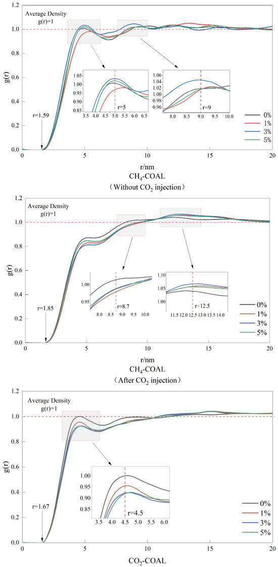 As shown in Figure 8, without CO2 injection, the CH4 molecules in the coal had two main adsorption layers located around X = 5 and X = 9. No obvious change in the position of the adsorption layer of CH4 was observed under the different moisture contents, so the initial position of CH4 was not the main factor that affected the displacement effect. With CO2 injection, the main adsorption layer of CH4 shifted from the original X = 5 and X = 9 to X = 8.7 and X = 12.5, respectively, and obvious desorption and diffusion occurred, indicating the feasibility of using CO2 injection for CH4 displacement. CH4 at 3% was highly concentrated in the distant adsorption layer (the best desorption effect), followed by CH4 at 1% and 5%, with little difference. In addition, during displacement, the distribution of CO2 was mainly concentrated in one adsorption layer located at X = 4.5. This layer is closer than the first adsorption layer of initial CH4, which indicates that the adsorption stability of coal and CO2 is better than that of CH4. Meanwhile, the distribution of CO2 on the adsorption layer decreased with the increase in the moisture content because with the increase in the water molecules and the formation of the water molecule layer, the adsorption distance of CO2 to the coal molecules increased. The analysis above shows that the adsorption stability of the CO2 molecules did not become stable. The molecule adsorption stability did not worsen; instead, the presence of the water molecule layer made the adsorption increasingly stable.