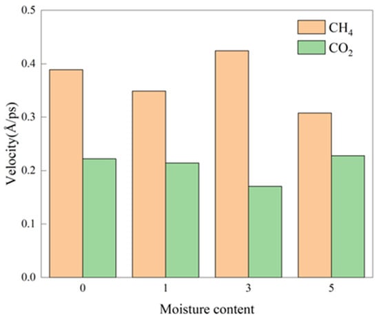 Figure 9 shows the distribution curve of the average movement speed of gas molecules in a certain direction during the process of CO2 displacement of CH4. When the moisture content was 0–1%, the movement speed of CH4 decreased, indicating that the presence of the water molecules impeded the movement of the CH4 molecules, which may be due to the existence of a certain degree of viscosity in the water molecules. However, when the moisture content was 3%, the movement speed of CH4 was high. On the contrary, the movement speed of the CO2 molecules decreased until a moisture content of 3%, where it reached the minimum value. This result means that at this time, the water molecules formed a water molecule layer with a large amount of CO2 molecules and resulted in CH4 desorption. The free space was mainly occupied by the CH4 molecules, and the diffusivity of the CH4 molecules was better than that of CO2. The CO2 molecules were not obstructed, which increased the movement velocity. However, when the moisture content reached 5%, the movement speed of CO2 increased, whereas the movement speed of CH4 decreased. These results indicate that when the water saturation level was exceeded, the secondary adsorption sites provided by the water molecules were not enough to promote CO2 adsorption, so some of the CO2 molecules desorbed into the free space. This occurrence prevented the movement of CH4 in the free space, thus decreasing the movement speed of CH4.