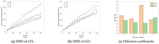 As shown in the figure, the MSD and diffusion coefficient of CH4 were lower than those without any moisture content, except for the 3% moisture content. This result indicates that the diffusion of CH4 molecules was hindered when the moisture content of the coal was 1% and 5%, and Zhou et al. [] found that the diffusion coefficients of CH4 and CO2 in lignite coal with a moisture content of 7.59 wt% were drastically reduced compared to dry coal. The adsorption of CO2 molecules was promoted at a 1% moisture content, which made the CH4 and CO2 molecules move in the opposite direction during diffusion. Collision occurred and hindered diffusion. At a 5% moisture content, many CO2 molecules existed in the free space, and they also hindered the diffusion of CH4 molecules. At a 3% moisture content, although the CH4 and CO2 molecules diffused in opposite directions, the adsorption of CO2 molecules by the moisture layer was so extremely strong that the collision process ended quickly, and no CO2 molecules existed in the free space to impede the diffusion of the CH4 molecules.