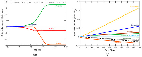 Mineral relative changes during CO2 storage in two different rock samples. (a) Claystone sample; (b) Dolomite sample [24].