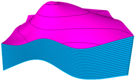 The synthetic anticline reservoir model demonstrates an asymmetrical design. The magenta and blue colors show the horizons and the layers, respectively.