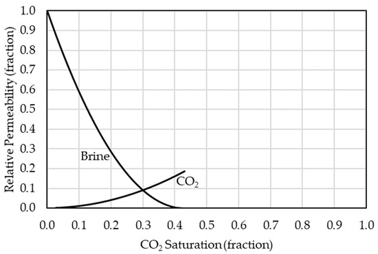 The simulator was utilized to continuously inject CO2 for five years in the anticline model in which five metric tons per day were injected continuously. After the five-year injection, the CO2 storage process in the aquifer with the plume migrations and geochemical interactions was examined for 195 years (i.e., 200 years of simulation). The simulation was performed in a finite saline aquifer model with closed boundaries. Also, the model assumed that the caprock acts as a perfect seal. During the simulation, the injected CO2 amount can be represented by free, dissolved, or trapped CO2 quantities within the aquifer. The CO2 solubility in the aqueous phase was calculated in the model via the Li and Nghiem method with the general Henry’s law [22]. Moreover, the saline water aquifer ionic composition, concertation, and CO2 molecular diffusion rates in the aqueous phase were based on Machado et al. [29]. Carbonate reservoir relative permeability curves were utilized in the model based on Bennion and Bachu (see Figure 4) [30]. Additionally, Carlson’s model for relative permeability was incorporated using Land’s trapping function, with a maximum residual gas saturation of 0.25, according to Burnside and Naylor [31,32,33].