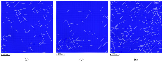 Natural fractures network realizations. (a) The first realization shows 95 fractures; (b) The second realization shows 49 fractures; (c) The third realization shows 189 fractures.