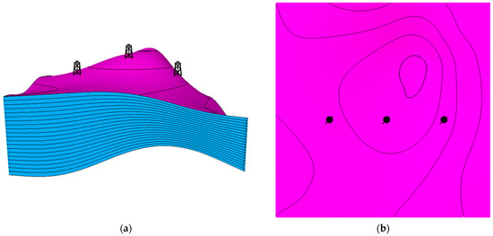 Locations of the injection wells. (a) Side view of the wells; (b) Top view of the wells. The magenta and blue colors show the horizons and the layers, respectively.