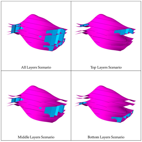 In each realization of the natural fracture network, four scenarios were considered to assess the impact of the vertical extension of the fractures on CO2 migration. The first scenario had the fracture extending across the entire aquifer, while the other scenarios had the fractures limited to the top, middle, or bottom zones. Figure 9 shows the differences between the vertical extensions in each scenario. In every scenario, the well location and injection zone were placed away from fractures to eliminate near-wellbore effects (see Figure 10). Initially, all the scenarios were analyzed without including geochemical reactions due to the computational runtime. The geochemical reactions were incorporated when the most influential scenario was determined. These scenarios should depict natural fractures’ unique signatures in a similar subsurface flow environment.