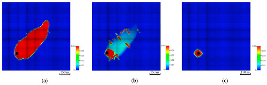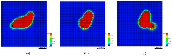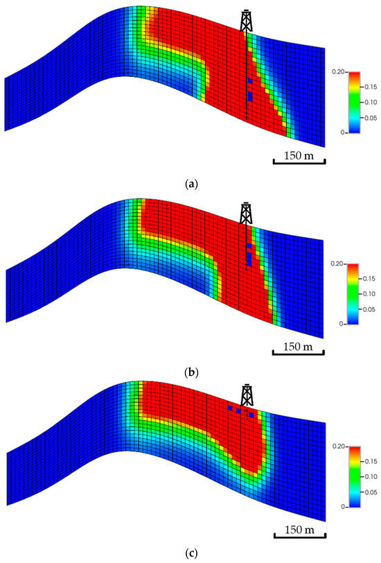 Top view of the global CO2 mole fractions of three different well locations after 200 years of simulation. (a) Global mole fraction distribution in the low-dip scenario; (b) Global mole fraction distribution in the top structure scenario; (c) Global mole fraction distribution in the high-dip scenario.
